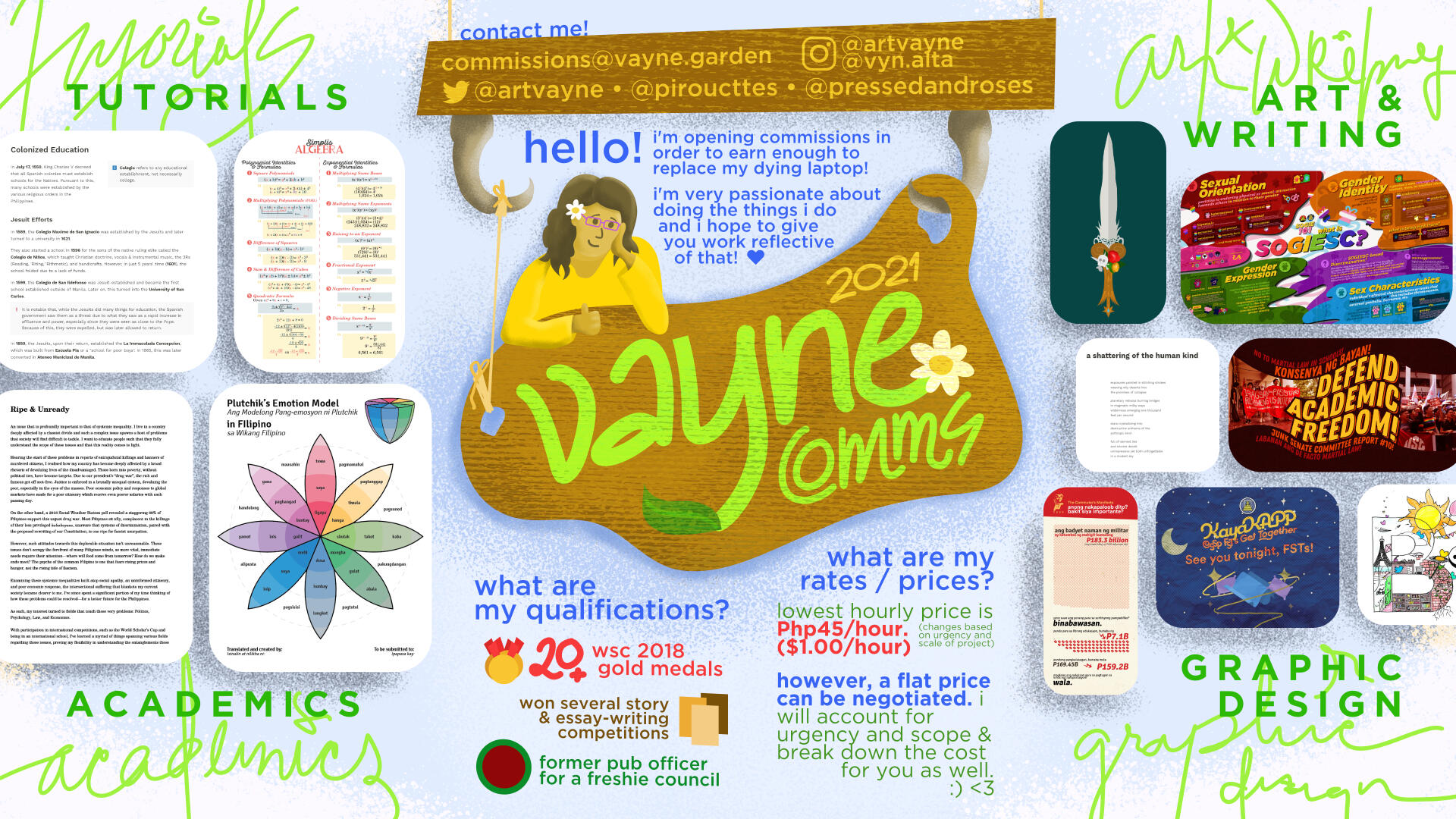 i am open to commissions (of course, subject to negotiations and realistic deadlines). you can contact me via email, instagram DM (@artvayne or @vyn.alta), or twitter DM (@artvayne, @pressedandroses, or @piroucttes)!be guided by a floor rate of Php45/hour ($1.00/hour). complexity/urgency may affect the base price. we can negotiate flat pricing as well, so i'm amenable to variances, but the floor is about $1.00/hour. payment can be sent through any means here or via bank transfer. we can talk about it over private message.